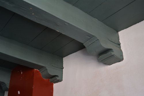 Binnen bevindt zich een enkelvoudige balklaag met balken in de lengterichting. Op de verdieping zijn onder de balken houten consoles aangebracht met een bijzonder, haakvormig profiel. Deze dateren vermoedelijk van de bouwtijd. De overige consoles lijken van na de verbouwing van 1662 te zijn. Een ander 17de-eeuws element in het interieur is een eikenhouten deurtje van rond 1615 in de tussenmuur op de verdieping. Verder bevindt zich op de verdieping nog een 18de-eeuwse kastenwand.