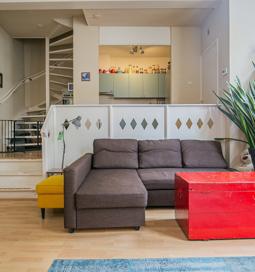 Entree (3,6 m²) en separaat toilet, toegang tot ‘split level’ woonkamer (31,6 m²) met bijzonder hoog plafond en halfopen keuken (5,0 m²).