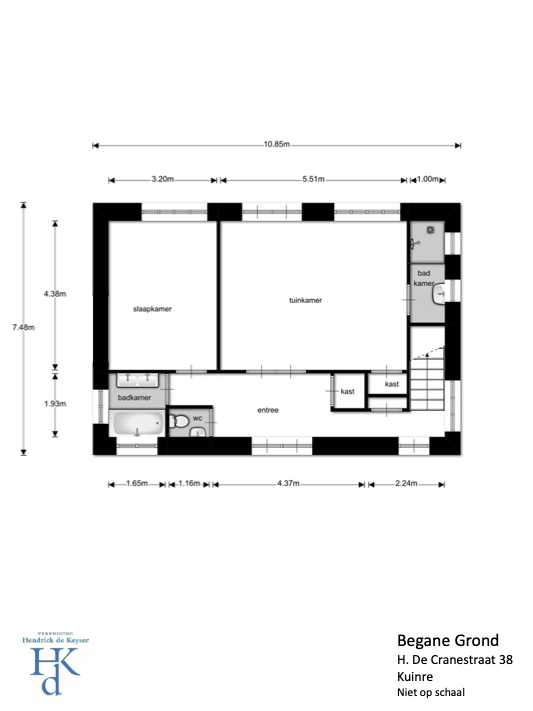 Indeling Entree met toegang tot een ruime (tuin)kamer (24 m2) met openslaande deuren naar de tuin. Doucheruimte met opstelplaats voor wasmachine. Aangrenzende slaapkamer (14 m2). Badkamer met ligbad en dubbele wastafel. Separate wc.