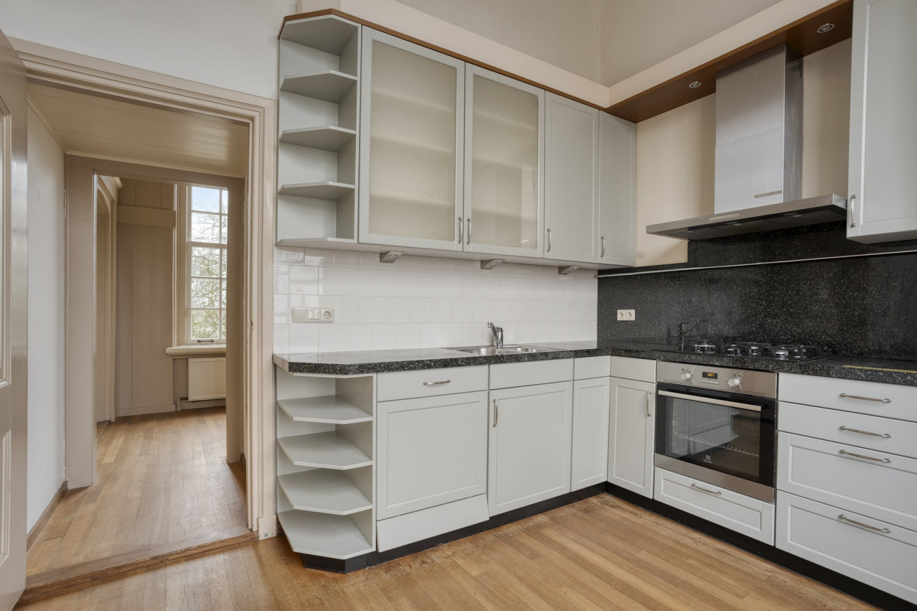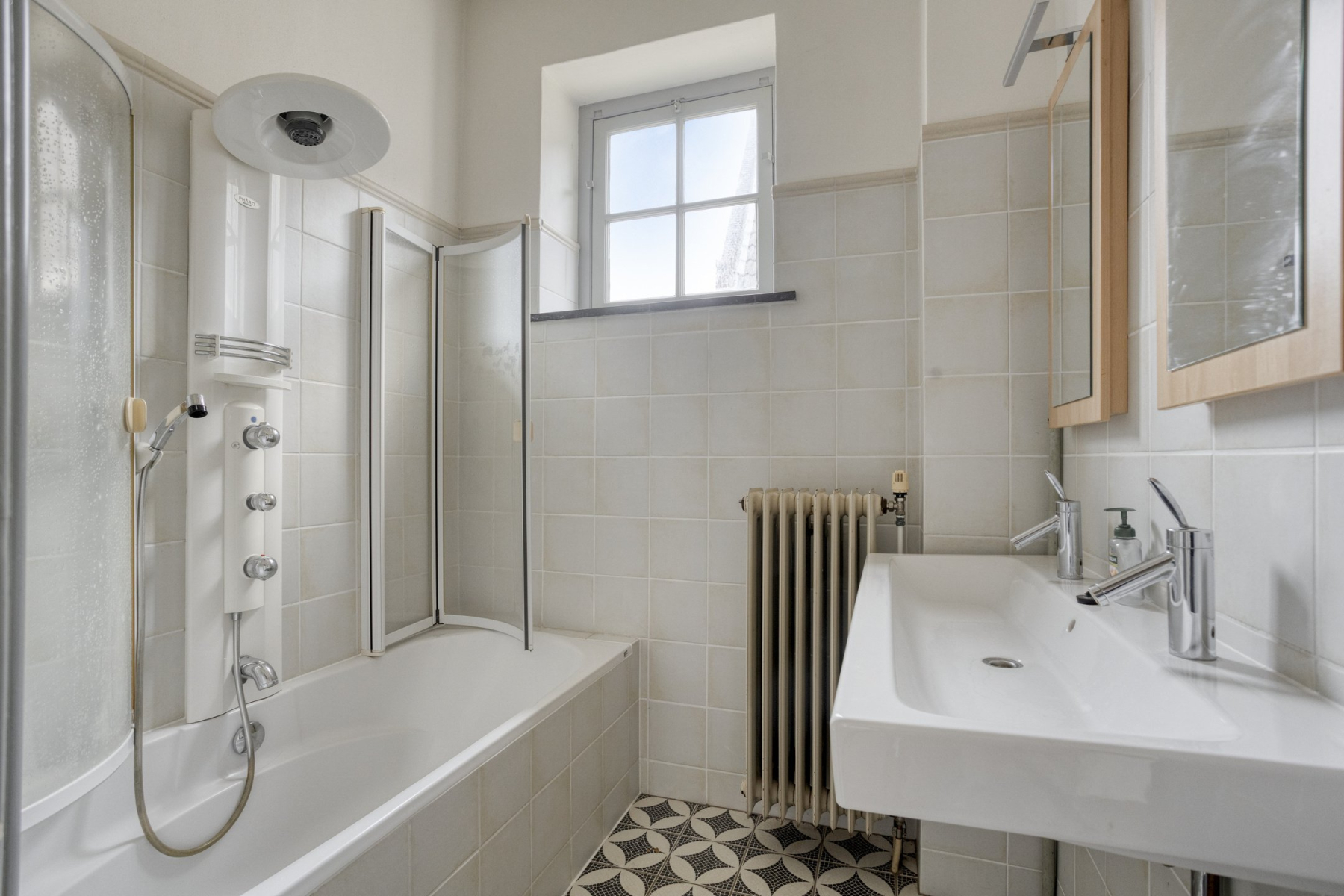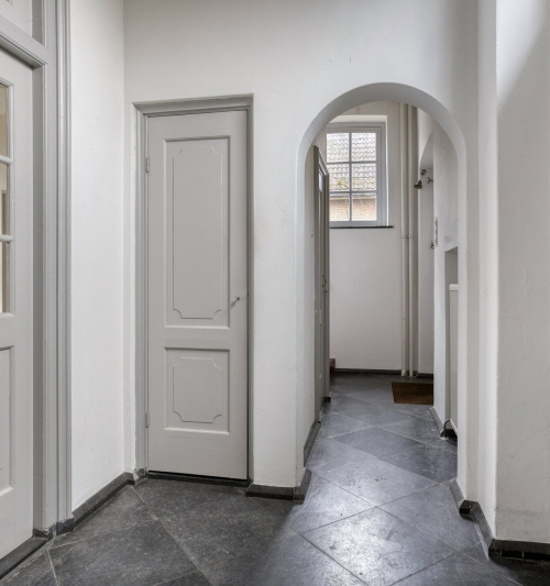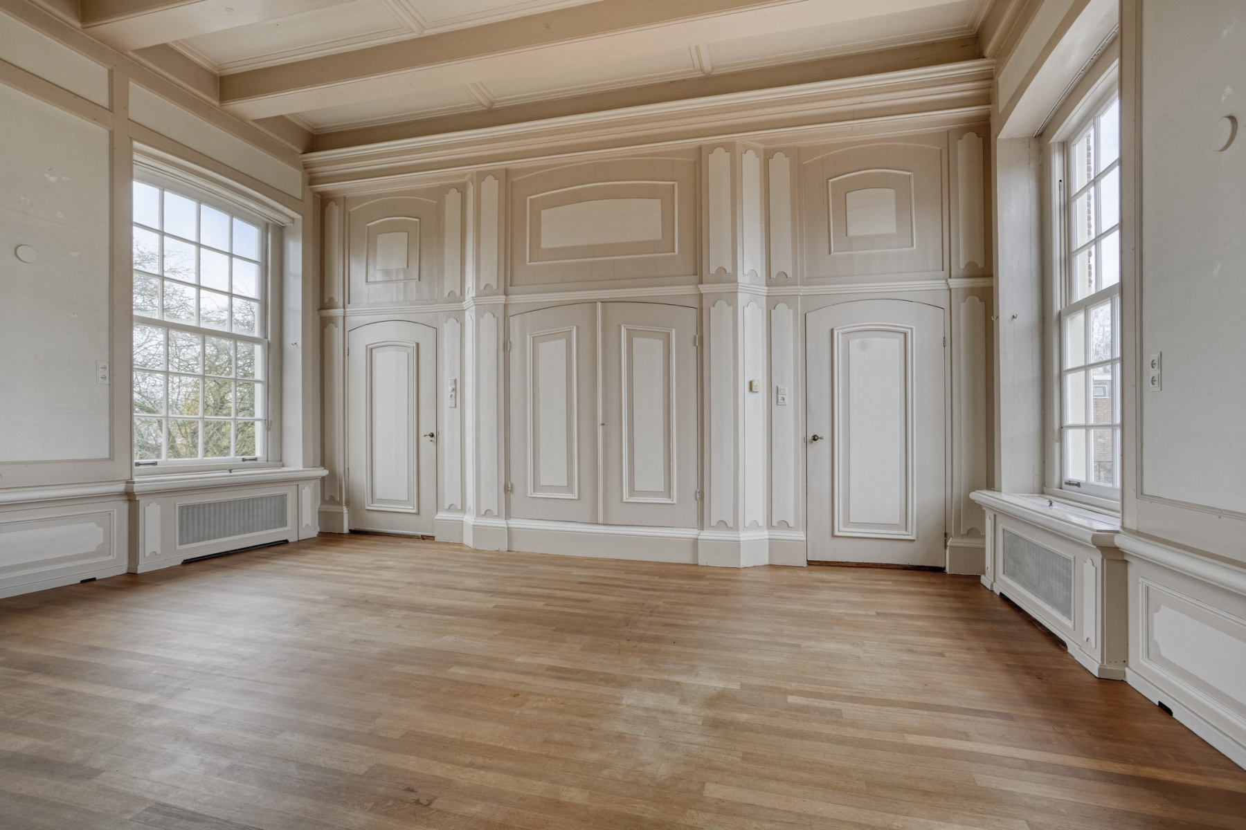 Eerste verdieping Ruime, lichte woonkamer (39 m2) met hoge plafonds, historische kastenwand en een prachtig uitzicht. Naastgelegen keuken (10 m2). Op de overloop een tweede wc.