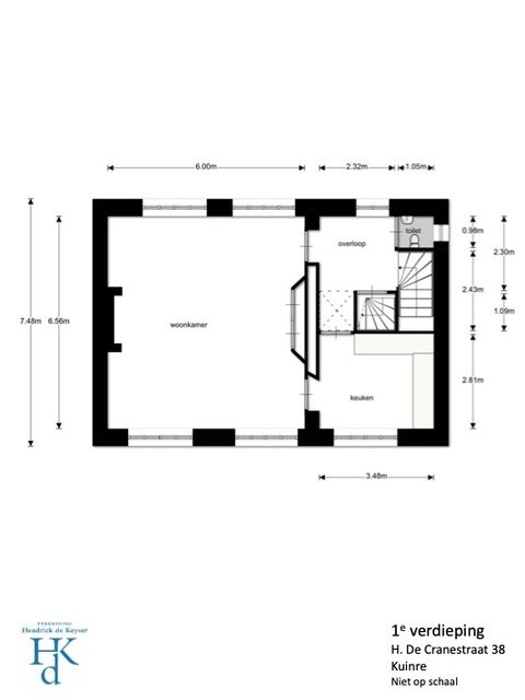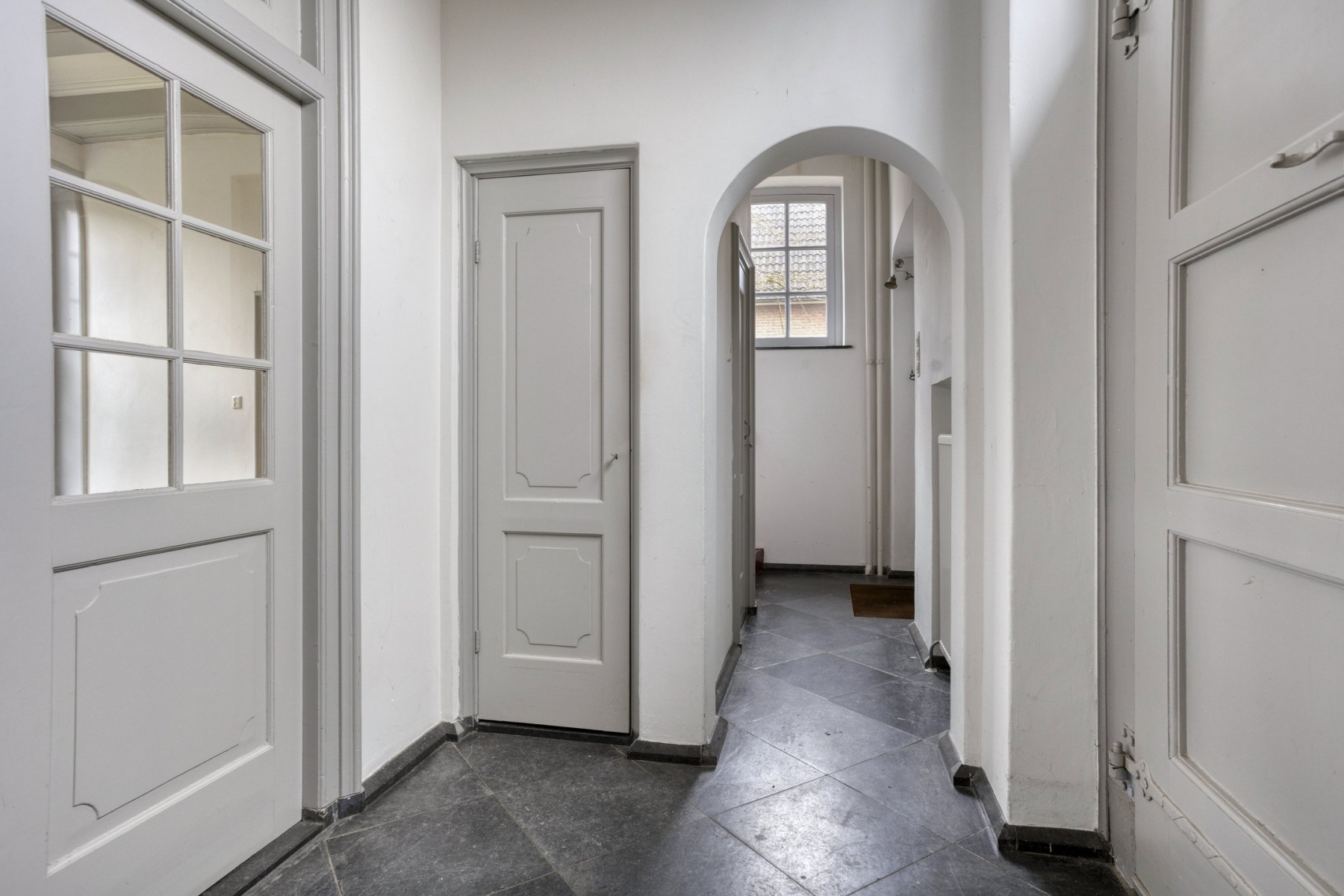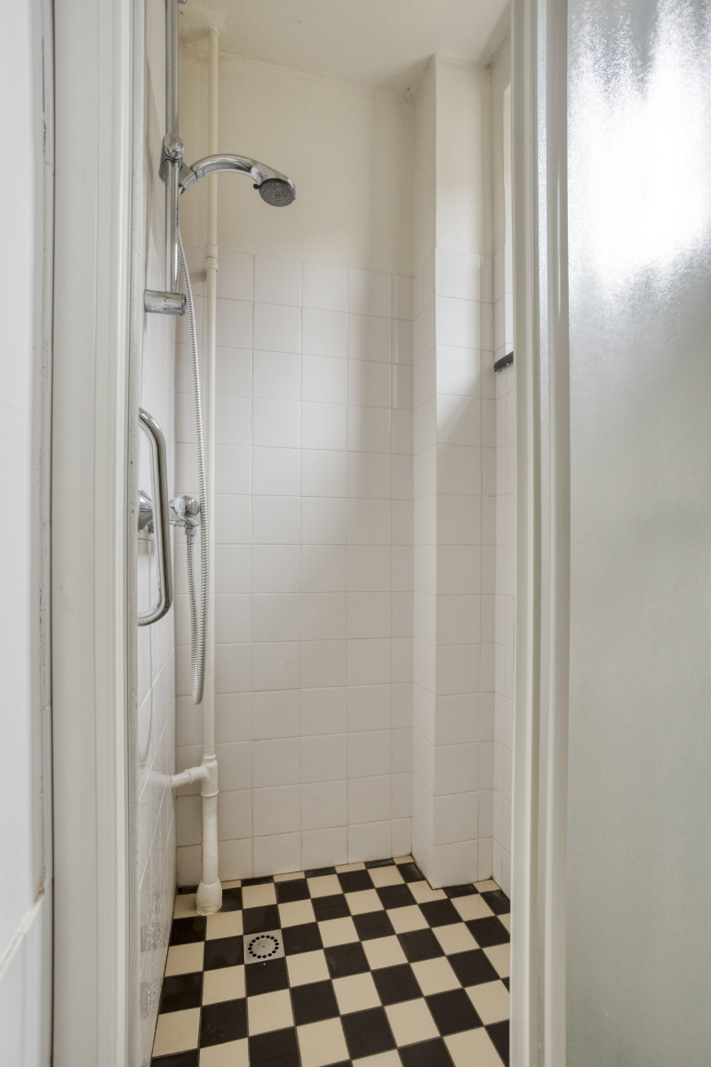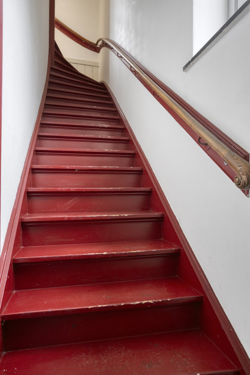 Eerste verdieping Ruime, lichte woonkamer (39 m2) met hoge plafonds, historische kastenwand en een prachtig uitzicht. Naastgelegen keuken (10 m2). Op de overloop een tweede wc.