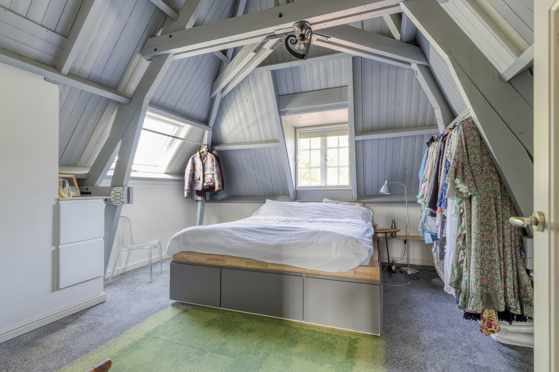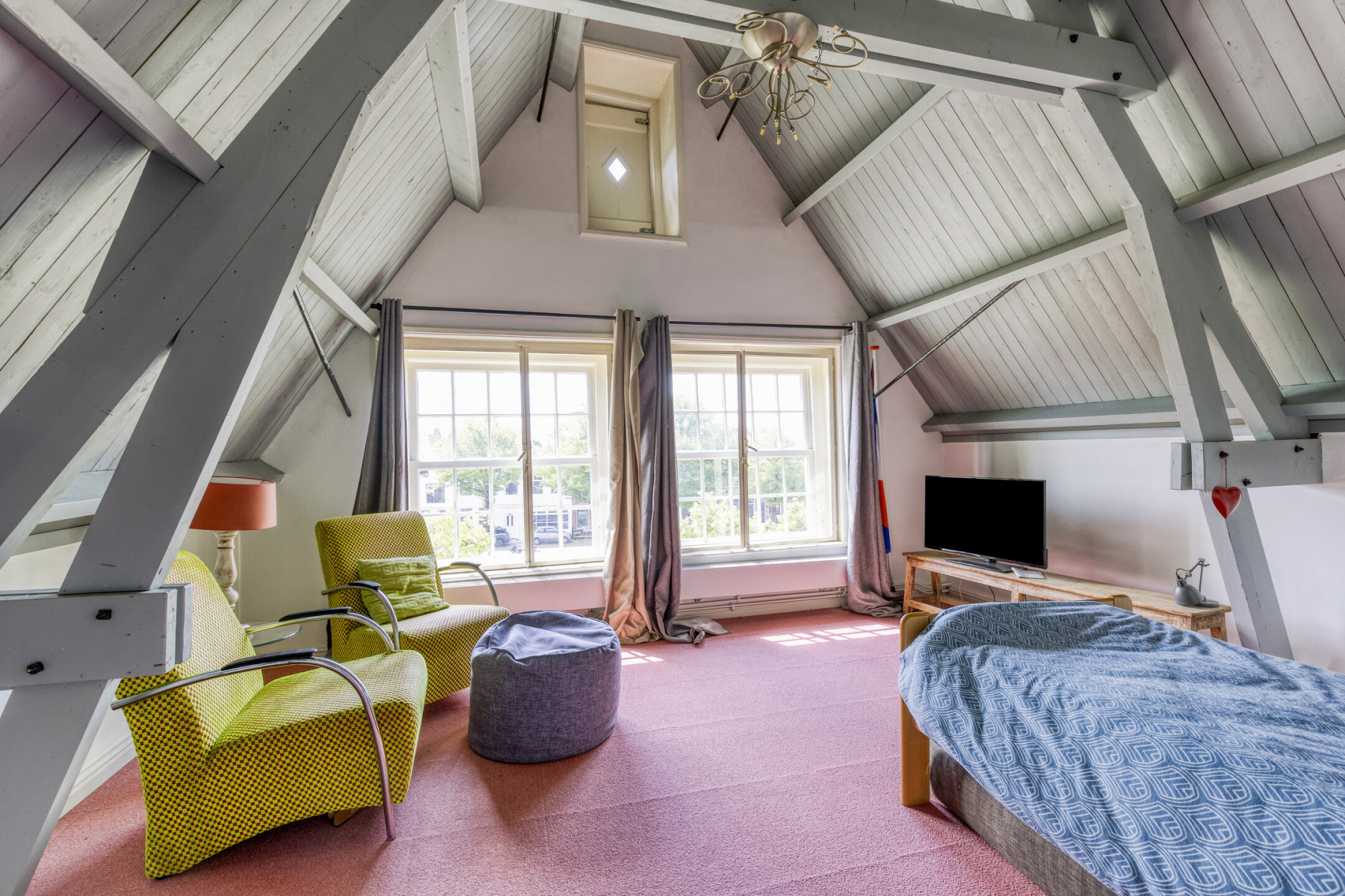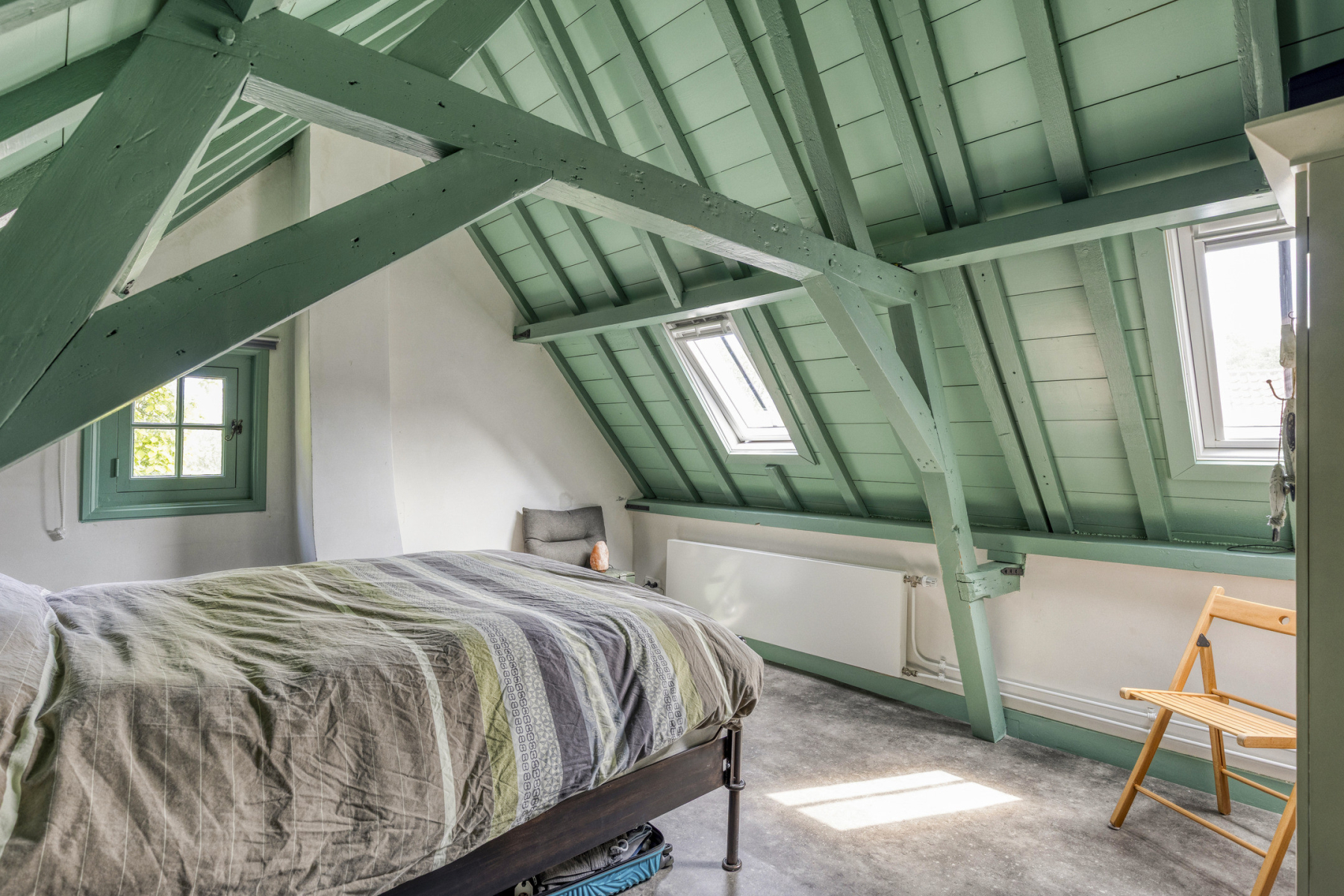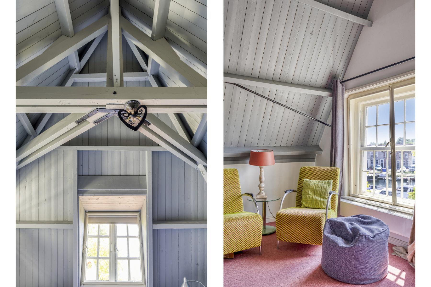 Tweede verdieping: De tweede verdieping van het voorhuis biedt ruimte aan een moderne badkamer (9,5 m²) met inloopdouche, vrijstaand bad, dubbele wastafel en aansluiting voor wasmachine en droger, een separaat toilet (1 m²) en twee ruime slaapkamers. Aan de voorzijde ligt de grootste slaapkamer (21,4 m²) met een hoog plafond onder de schuine kap, en aan de achterzijde ligt de tweede ruime slaapkamer (19 m²), ook met een hoge schuine kap. In beide slaapkamers is de prachtige dakconstructie in het zicht.