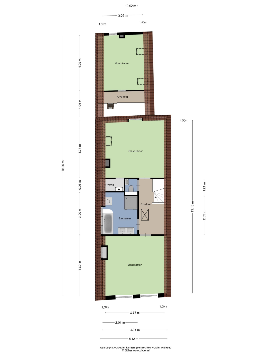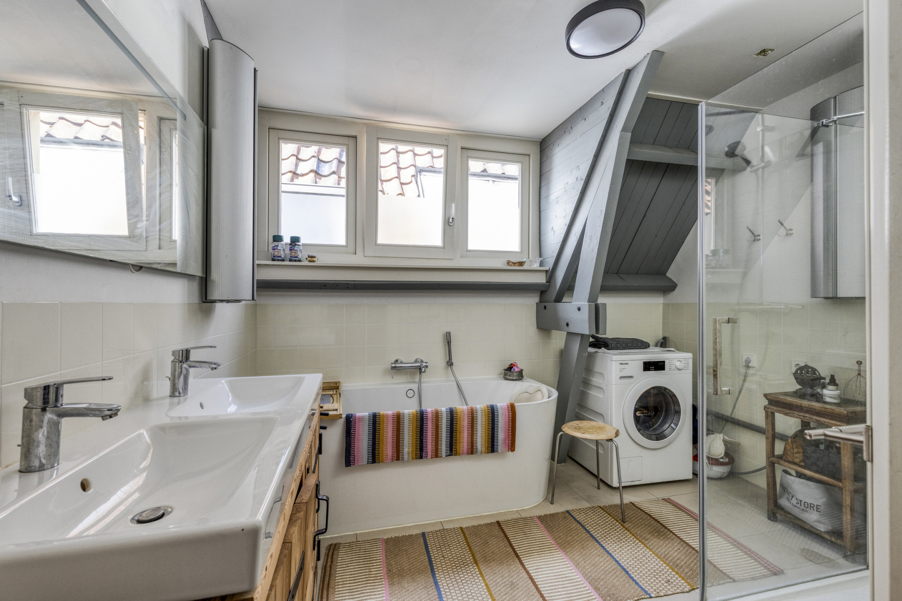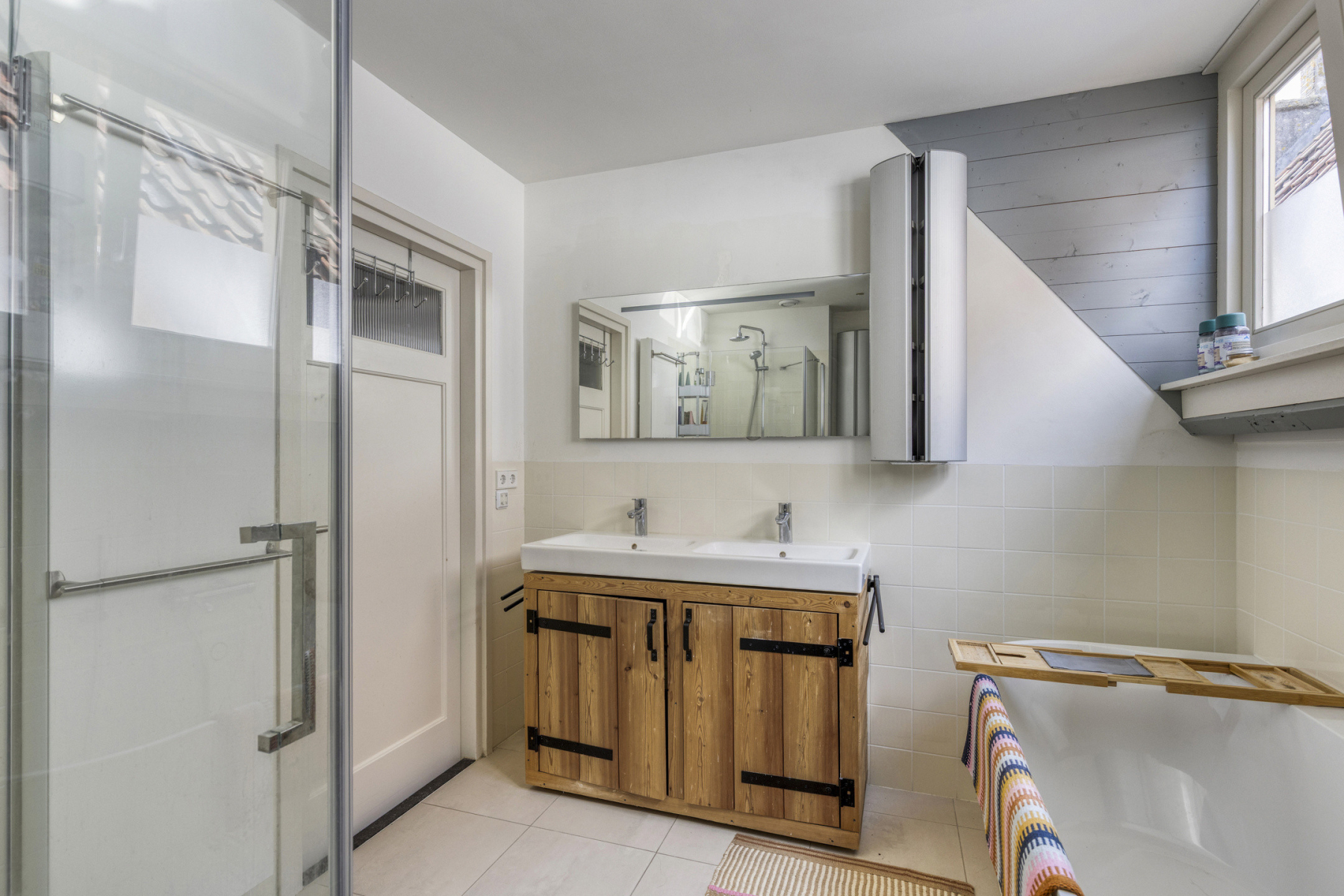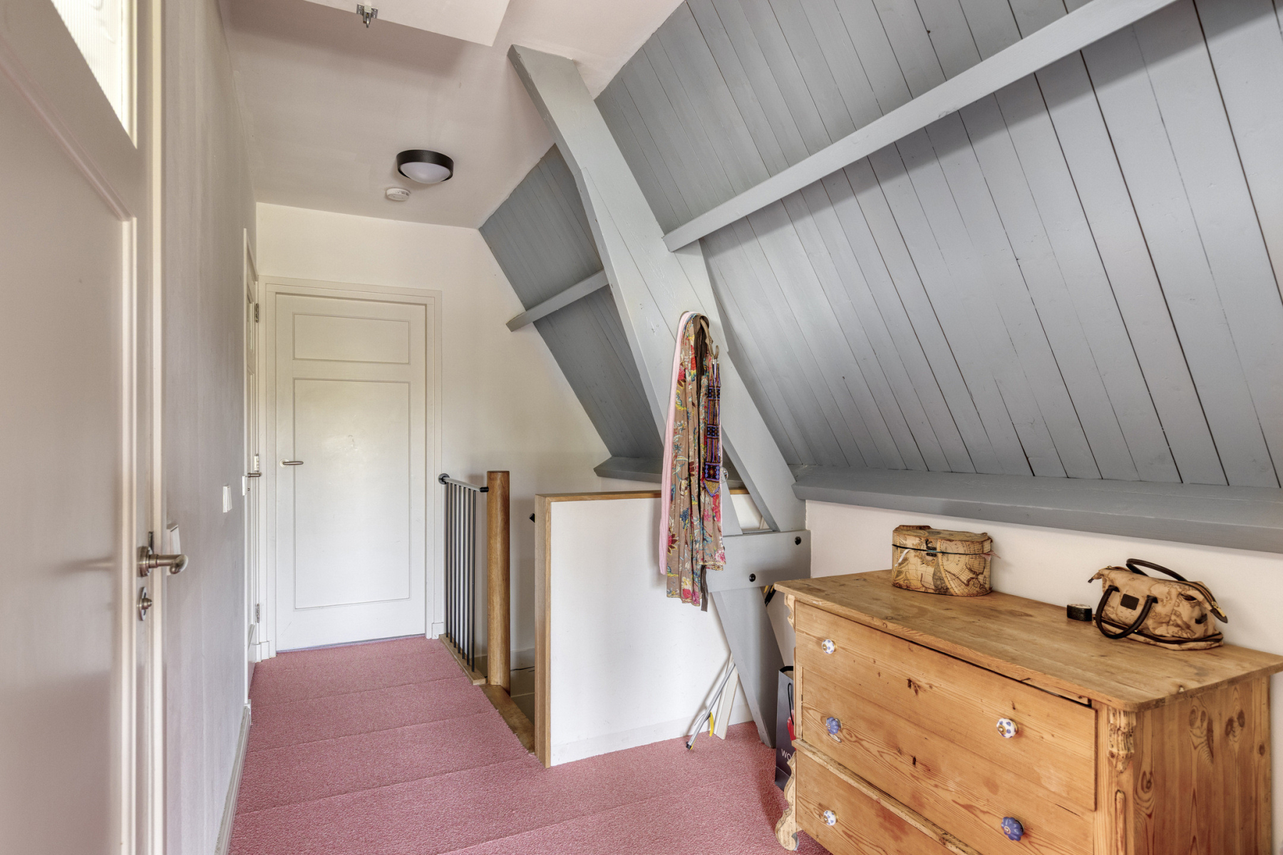 Tweede verdieping: De tweede verdieping van het voorhuis biedt ruimte aan een moderne badkamer (9,5 m²) met inloopdouche, vrijstaand bad, dubbele wastafel en aansluiting voor wasmachine en droger, een separaat toilet (1 m²) en twee ruime slaapkamers. Aan de voorzijde ligt de grootste slaapkamer (21,4 m²) met een hoog plafond onder de schuine kap, en aan de achterzijde ligt de tweede ruime slaapkamer (19 m²), ook met een hoge schuine kap. In beide slaapkamers is de prachtige dakconstructie in het zicht.