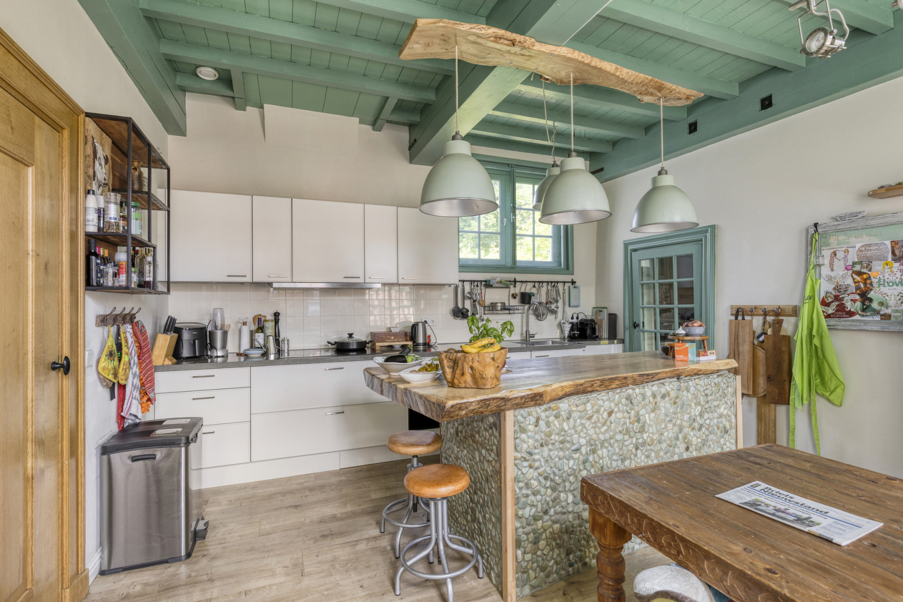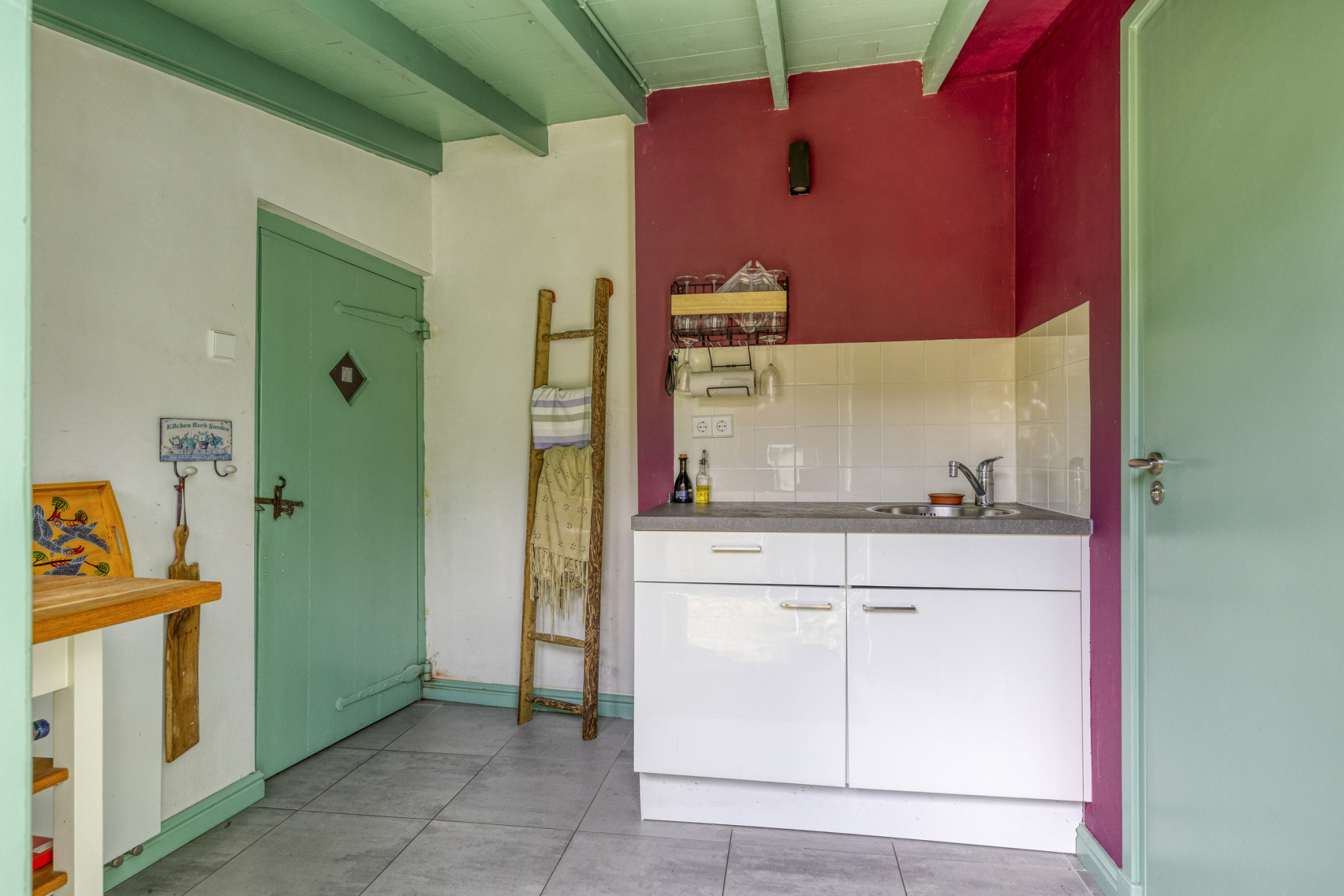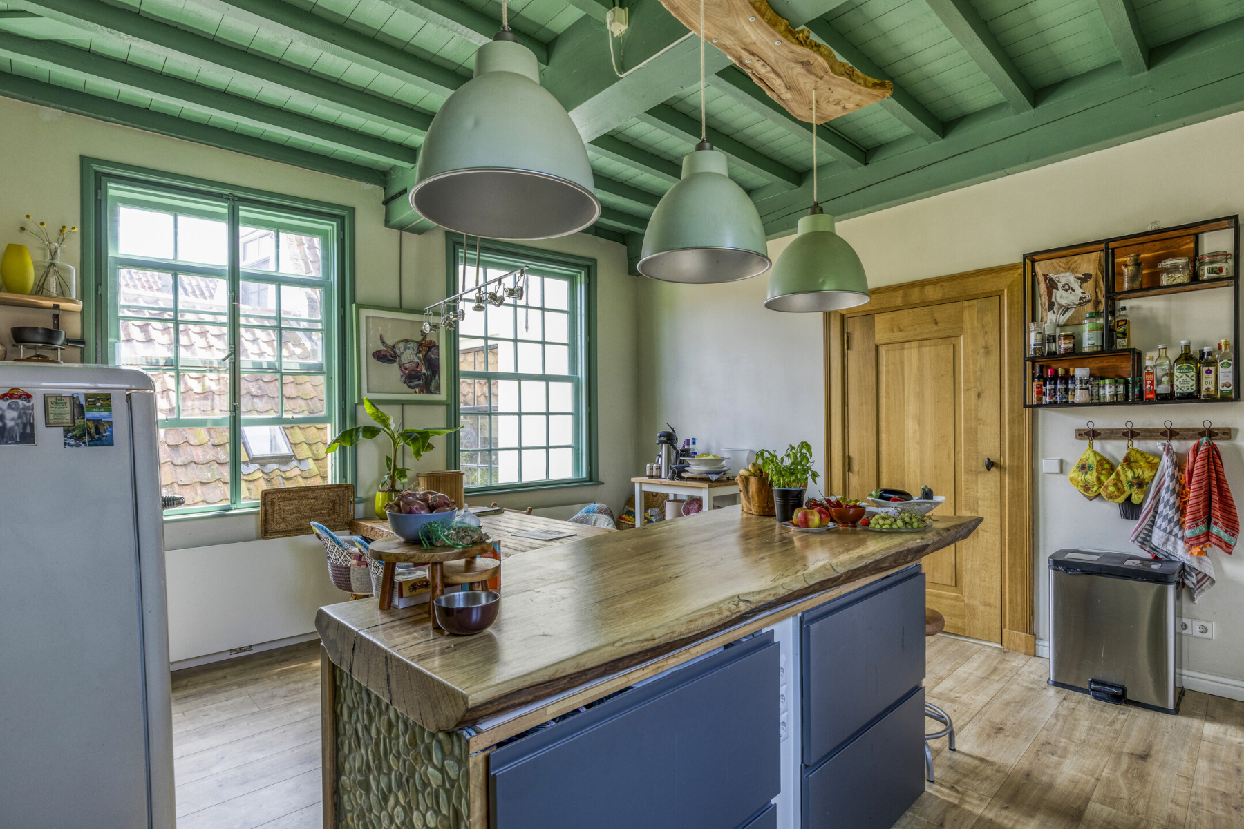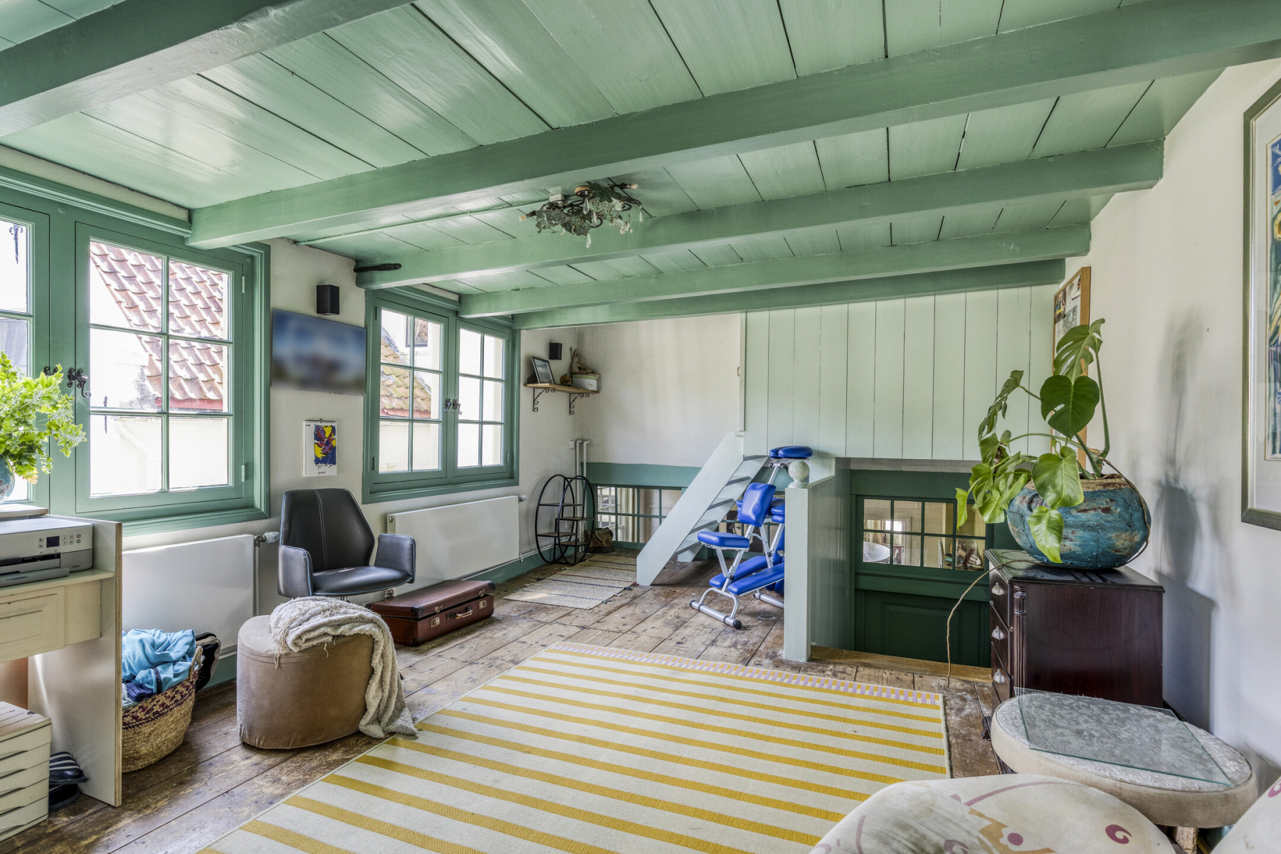 Eerste verdieping: De eerste verdieping van het voorhuis is te bereiken via het trappenhuis in de voorkamer. De overloop (2,5m²) geeft toegang tot een garderobekast (0,6 m²) , toiletruimte (1,8 m²), een woon- of slaapkamer (34,5 m²) aan de voorzijde en de keuken aan de achterzijde (ca. 22m²). De voorkamer heeft een hoog plafond van moer- en kinderbinten, een ingebouwde kast (2 m²) en een prachtig uitzicht op de haven. De ruime en moderne keuken aan de achterzijde van het stenen voorhuis geeft via een halletje met een tweetal trapjes ook toegang tot de eerste verdieping (22,4 m²) en zolder (16,6 m²) van het achterhuis. Deze laatste ruimte is ook te gebruiken als extra slaapkamer.