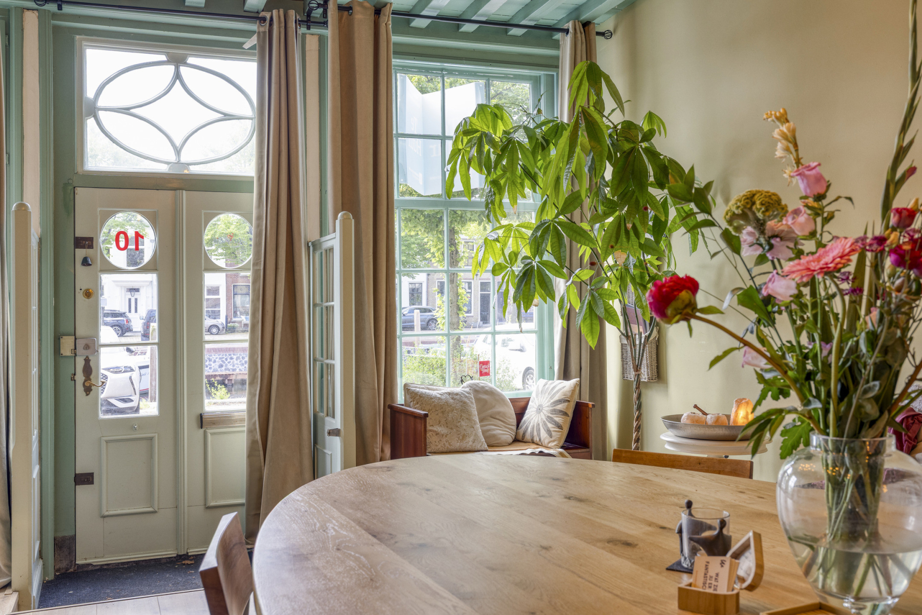 Begane grond: De entree van het pand bevindt zich centraal in de voorgevel. De poort geeft direct toegang tot de tuin en de achteringang. In de voorkamer (ca. 48 m²) zit een prachtig houten plafond bestaande uit moer- en kinderbinten. Van hieruit is het trappenhuis te bereiken en de achterkamer (ca. 22 m²). Deze lichte ruimte is teruggebracht naar de 19de -eeuw. Van hieruit kan een achterkamer (ca. 22 m²) worden bereikt en de trap naar de 1ste verdieping van het achterhuis. Achterin deze ruimte is de toegang tot de houten een-laagse aanbouw (ca. 7 m²) met daarin een toilet en een kleine pantry.