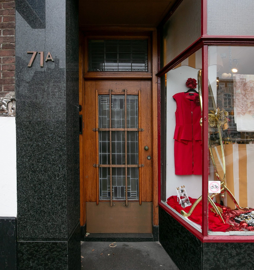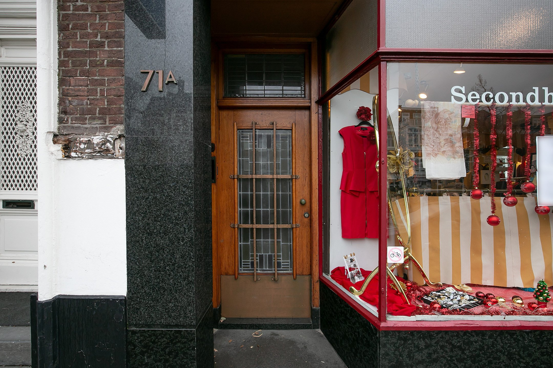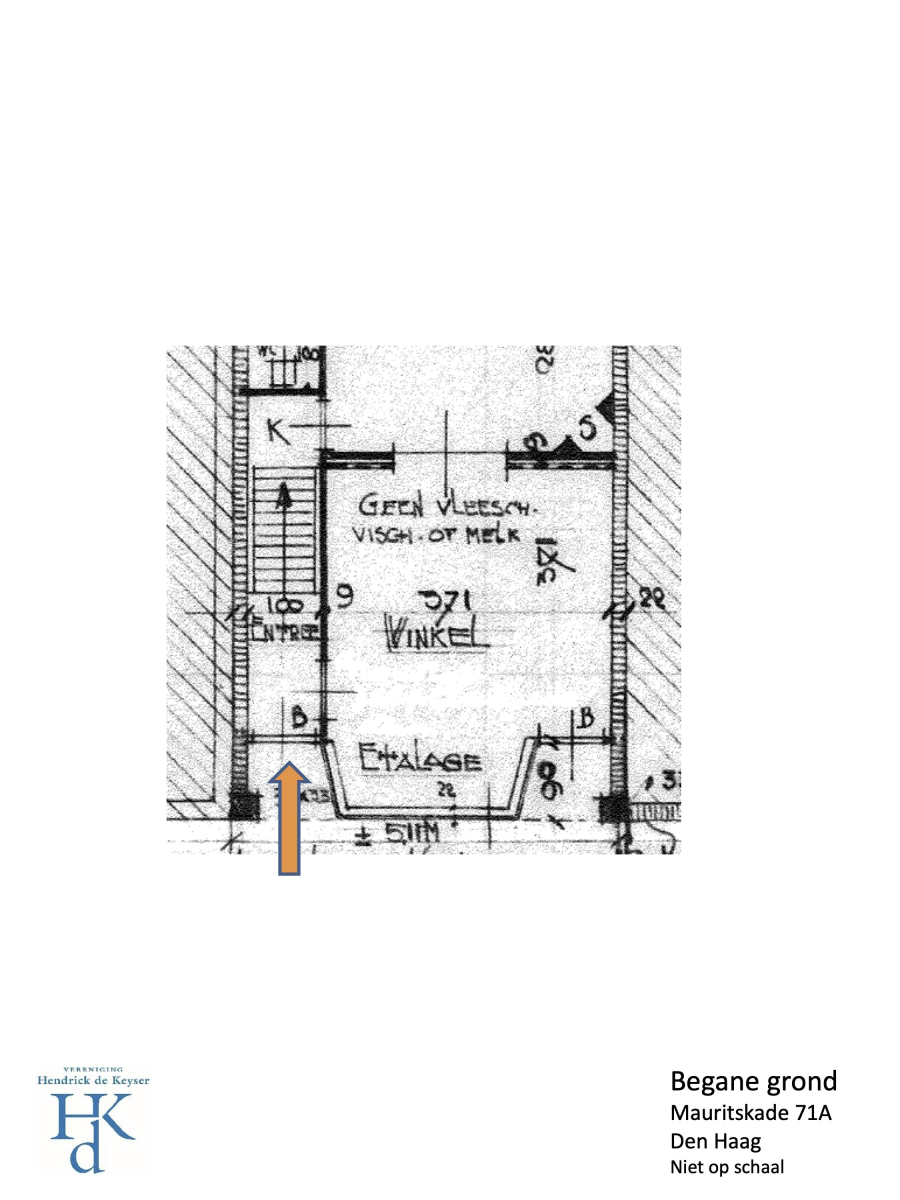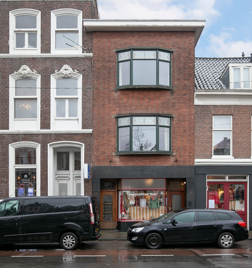 Een eenvoudig mid-19de -eeuws winkel-woonhuis van 3 bouwlagen, waarvan het woonhuis te huur is en zich op de 1ste en 2de bouwlaag bevindt. In 1939 is het pand voorzien van een nieuwe gevel met donkerrode handvormstenen en terugliggende portalen aan weerszijden van de etalage. De bovenwoning is hiermee zelfstandig te bereiken. Opvallend zijn de grote stalen erkerramen met glas-in-lood in de bovenlichten.