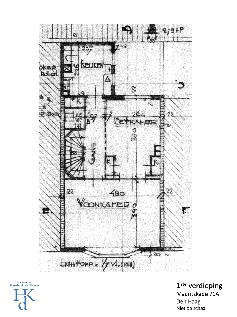 De gang (4 m2) geeft toegang tot een ruime woonkamer aan de voorzijde (16 m²) over de volle breedte van het pand. Hier is een zeer ruime erker met uitzicht op de Mauritskade. Via schuifdeuren met glas-in-lood is er een eetkamer (10 m²) met vaste kasten aan de achtergevel. Vanuit de gang is in de aangebouwde jaren dertig keuken (5,3 m²) te bereiken met granito aanrechtblad, porceleine spoelbak en rookkap. De keuken is voorzien van een kooktoestel met oven, een smalle vaatwasser en een hoge koelkast.