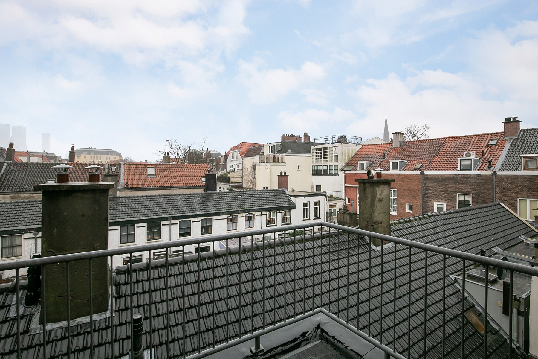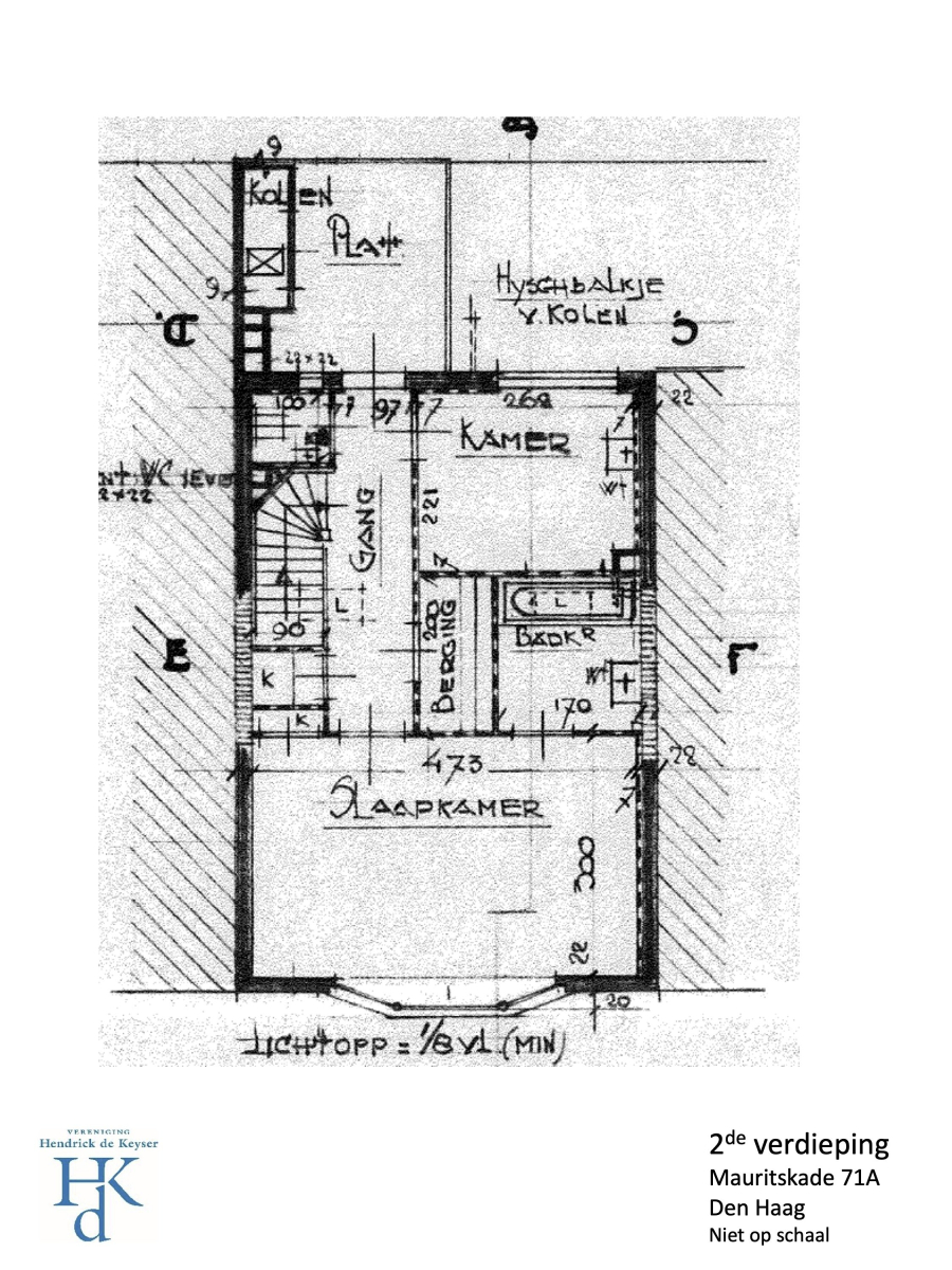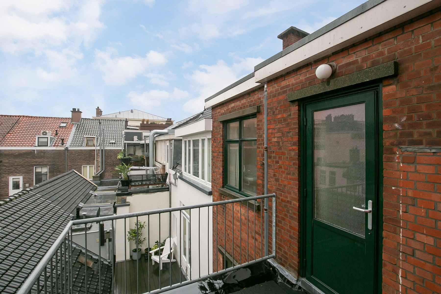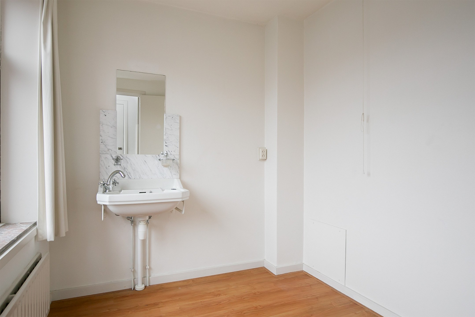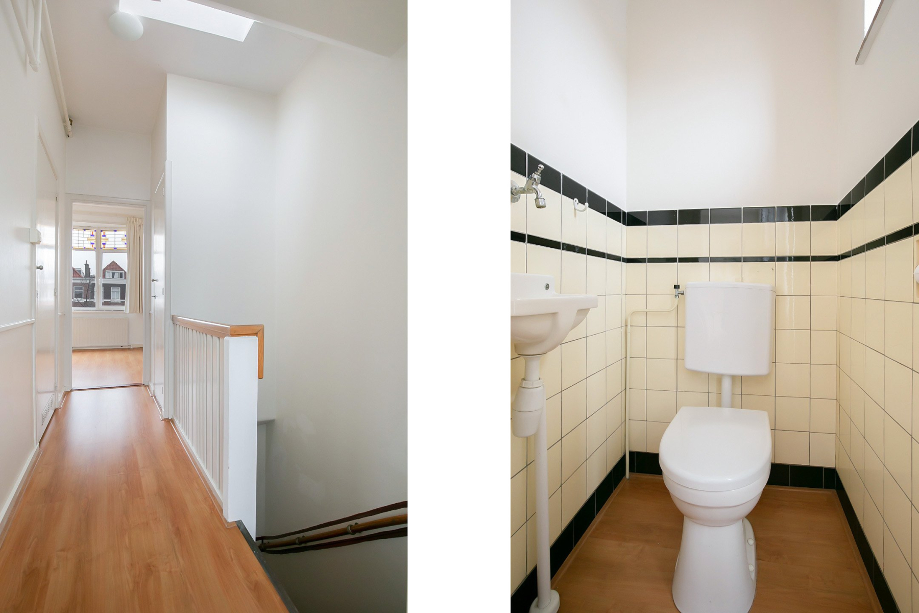 De trap leidt naar de overloop (4 m2) op de tweede verdieping. Hier zijn de toilet (1 m2), het dakterras (6m2), een kleine slaapkamer aan de achterzijde (5,4 m2), een ruime berging met douche en wasmachineaansluiting (1,7 m2) en de grote slaapkamer aan de voorzijde te bereiken. De slaapkamer (14 m2) is weer over de volle breedte en heeft ook een erker. Via deze slaapkamer is de badkamer (3,4 m2) met bad en wastafel bereikbaar.