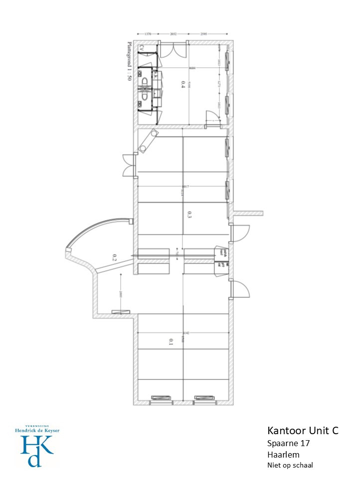 Via de centrale hal zijn ruimtes 0.1 en 0.3 te bereiken (zie plattegrond). Ruimte 0.1 (de historische 'tuinkamer') is een kantoorruimte (59 m²) voorzien van prachtige wandafwerking en heeft uitzicht op de rustig gelegen gemeenschappelijke tuin. Aan de linkerzijde is een serre (ruimte 0.2), met een opstelplaats voor een printer/kopieermachine (9 m²), voorzien van mechanische ventilatie.