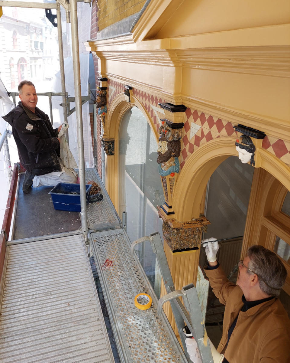 - De atlanten (koppen met baard) en de keramieken kopjes, gemaakt door Clemens uit Gouda, werden aan de hand van het kleuronderzoek geschilderd. Er zijn heel veel kleuren gebruikt, die allemaal met de hand gemengd zijn, allemaal in hun eigen koffiebekertje. Er is gekozen voor traditionele lijnolieverf van RIGO, omdat dit makkelijker mengt en het houtwerk beter later ademen dan moderne synthetische verf.